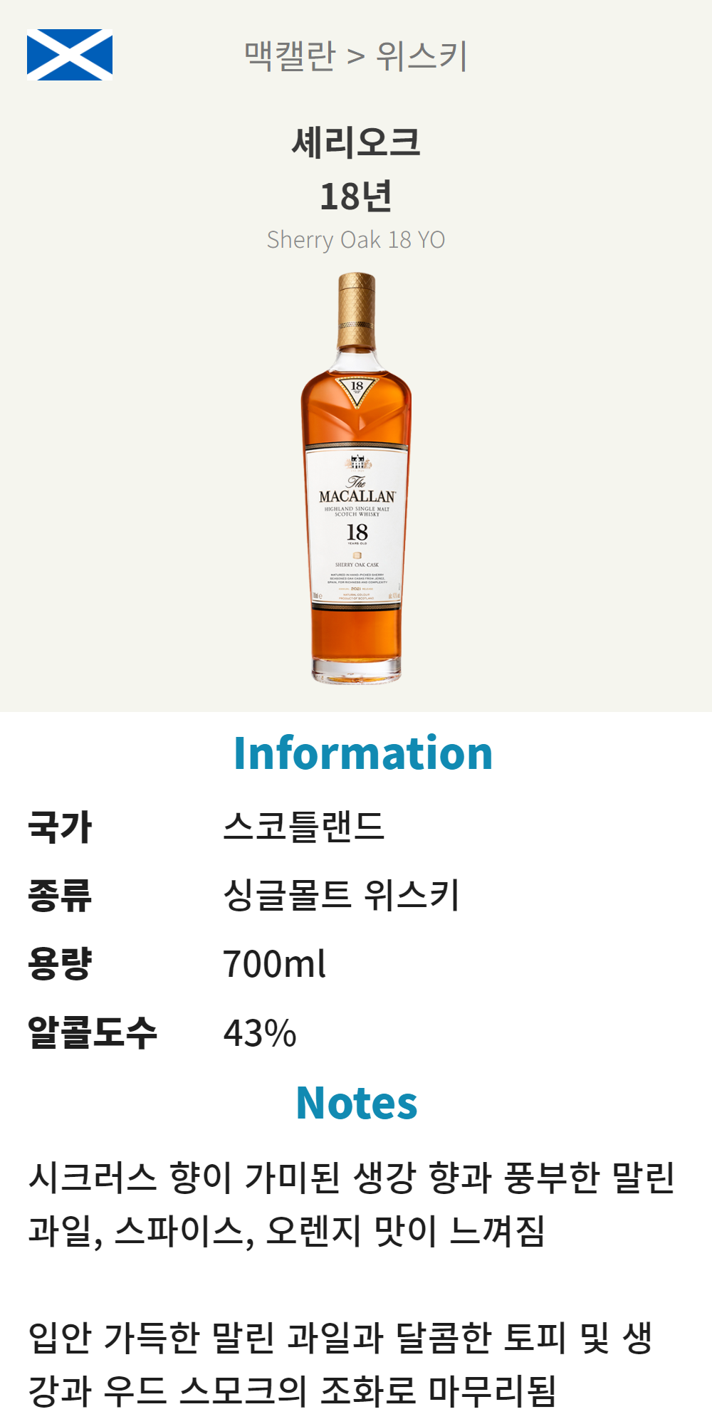 맥캘란 18년 셰리 오크 (스코틀랜드/싱글몰트 위스키/700ml/유흥)