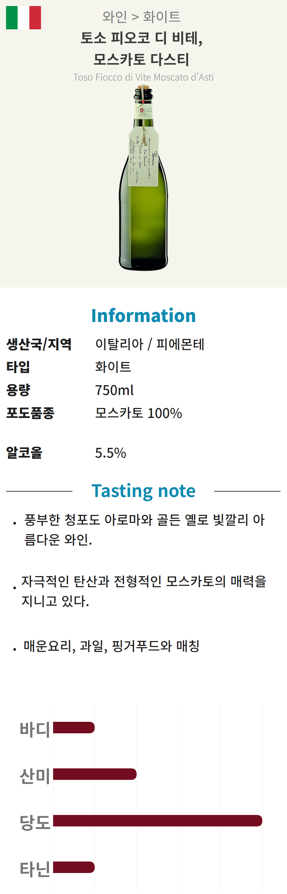 토소 피오코 디 비테 모스카토 다스티 (이탈리아/화이트/스위트/스파클링) [2월중 재입고 예정]