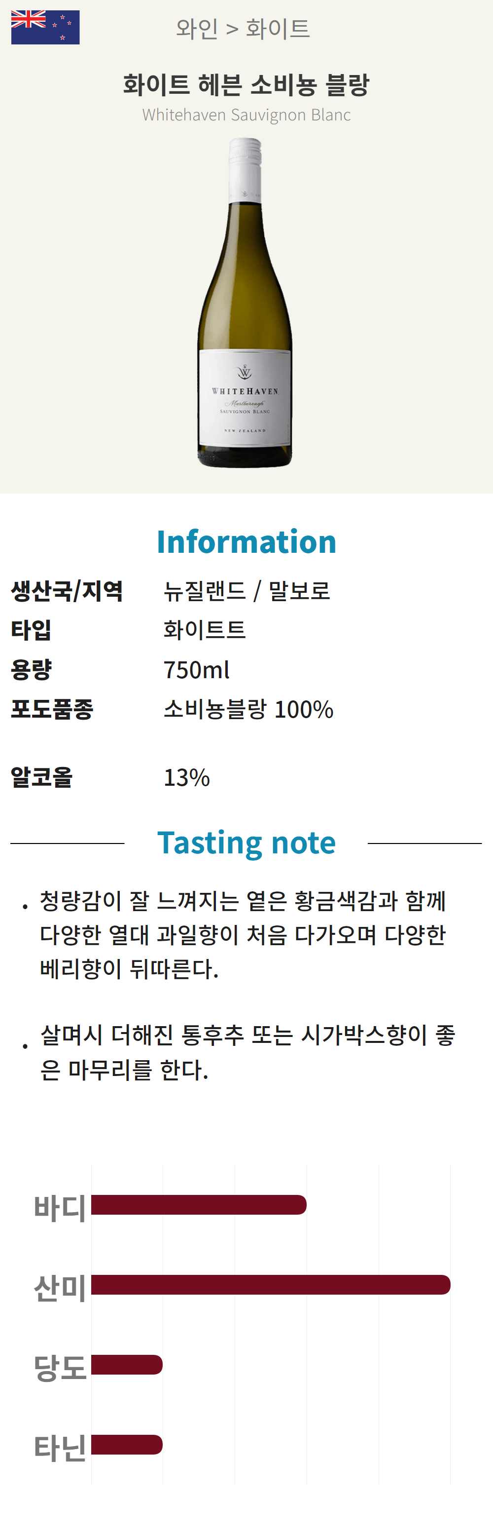 화이트헤븐 소비뇽블랑 (뉴질랜드/산미/화이트)
