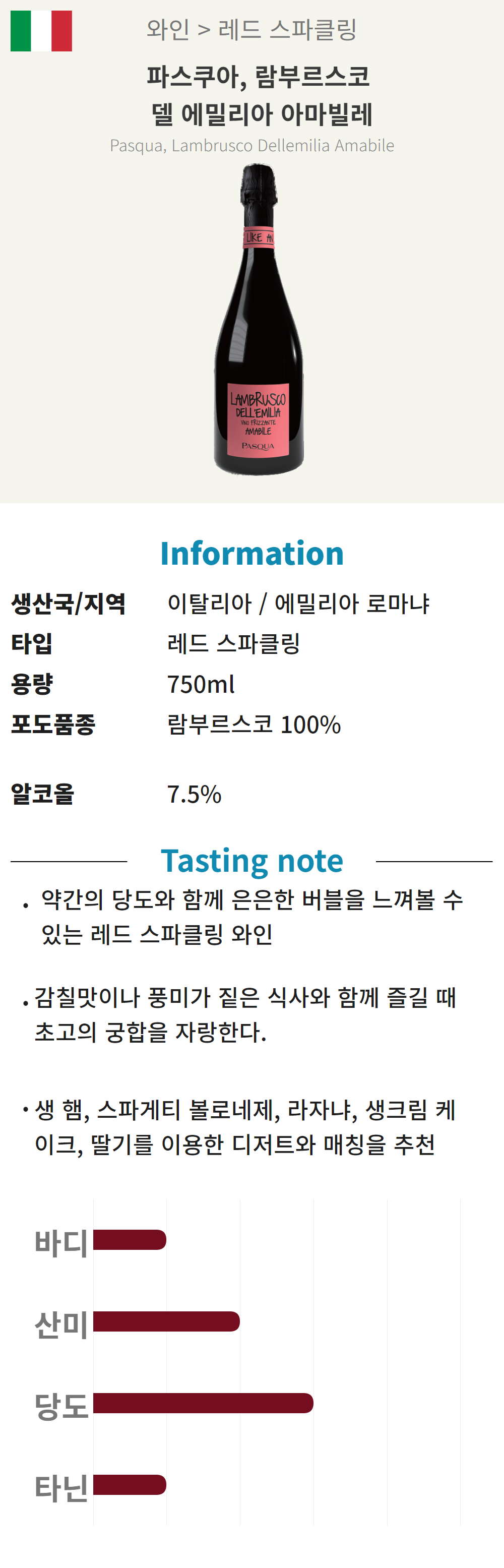 파스쿠아, 델 에밀리아 아마비레 (이탈리아 / 레드 스파클링 / 스위트)