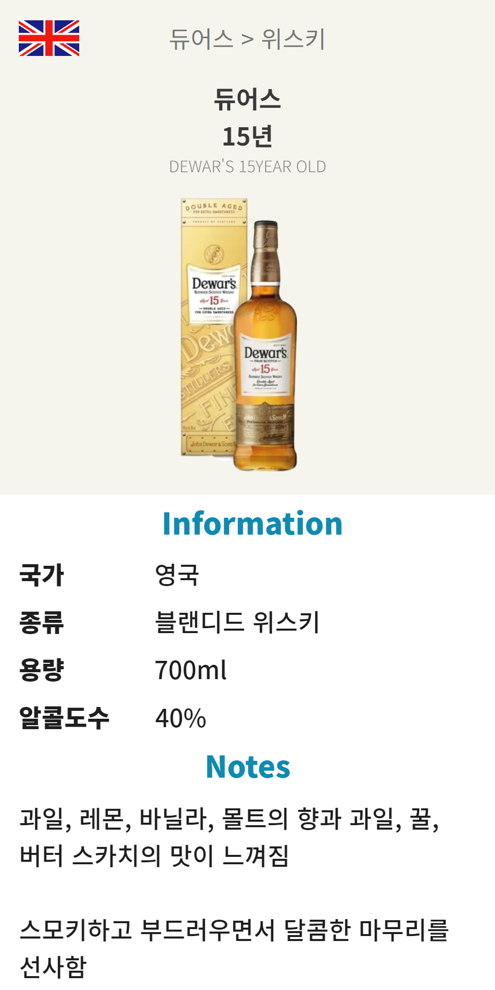 듀어스 15년 (영국/블랜디드 위스키/700ml/가정)
